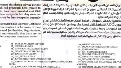 أعلنت سلطة الطيران المدني بالسودان عن إلغاء شهادات المُشغل الجوي لعدد “43” شركة طيران خلال فترات متفاوتة، وأوضحت أنها أرسلت…
