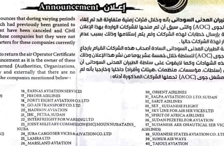 أعلنت سلطة الطيران المدني بالسودان عن إلغاء شهادات المُشغل الجوي لعدد “43” شركة طيران خلال فترات متفاوتة، وأوضحت أنها أرسلت خطابات للشركات ولم يتم استلامها لعدم وجود عناوين ومقار.