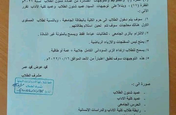 قرار جديد جامعة دنقلا تصدر لوائح تمنع دخول الجامعة بالسفنجات والعبائة الشاذة والازياء الرياضية