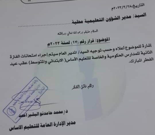 قررت التربية والتعليم تأجيل إمتحانات الفترة النهائية للمرحلتين الإبتدائية والمتوسطة بولاية الخرطوم عقب عطلة عيد الفطر المبارك. وحمل خطاب ممهو بتوقيع المدير العام لمرحلة التعليم الأساس القرار الخاص والذى شمل المدارس الحكومية والخاصة